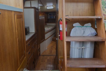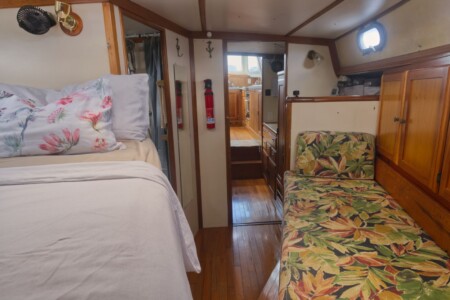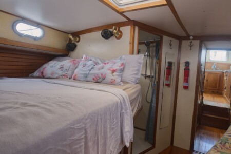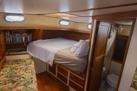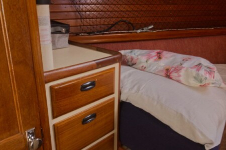 Starting forward, the guest stateroom is fitted with a V-berth and a new mattress. Four drawers are located beneath the berth, with netting for gear storage to port and starboard, and a bureau with four drawers aft. A large, lit locker is positioned aft of the bureau. Reading lights are mounted on both sides, along with two 12V sockets for fans and chargers. Access to the chain locker is forward of the berth through a door.