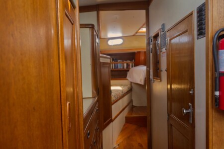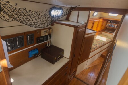 Two steps down from the deck saloon, in the starboard-side passageway to the aft cabin, is a well-equipped chart table, drawers, and storage beneath, plus a hanging locker to the side. Outboard are the electrical panels, Starlink router, EPIRB, AIS, indoor VHF radio station & two 12V sockets. To port is the access door to the engine room, along with display panels for the watermaker, solar array, and inverter.