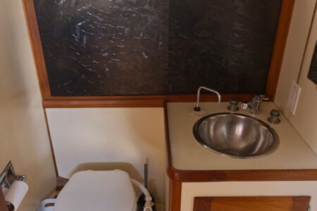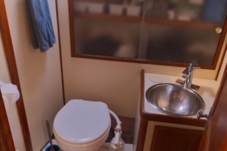 The ensuite head is located forward and to port of the berth. It features a Raritan manual head with a full-size seat (matching the forward head), a stainless-steel sink set into a vanity with a new faucet and storage below, and a large sliding-door cabinet outboard. The shower is integrated into the space, with a 360° curtain keeping the compartment dry. A Caframo fan ensures optimal ventilation for moisture control.