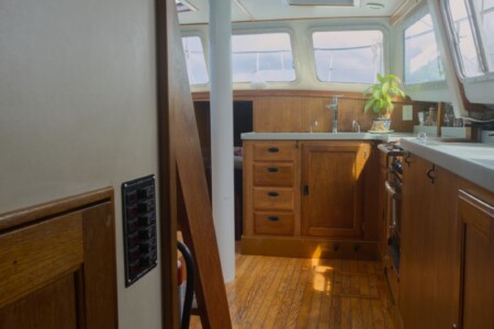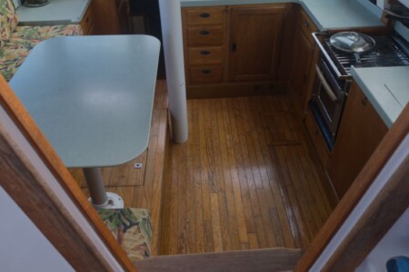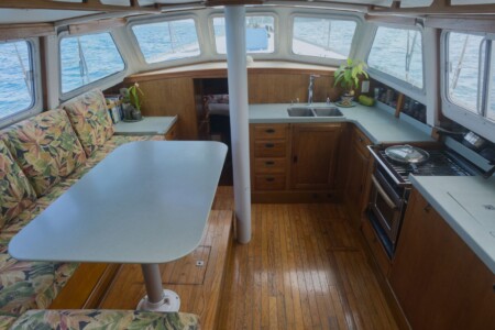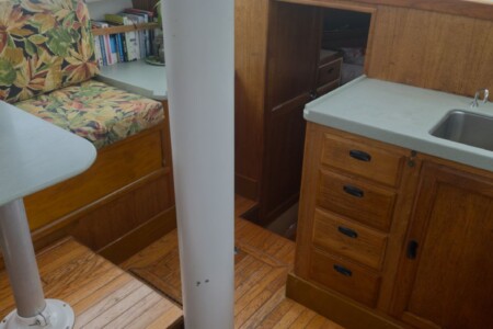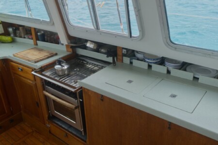 The galley is located to starboard in the saloon and offers generous Corian countertop space for meal preparation. A deep double stainless-steel sink with a new faucet is set into the forward counter. A saltwater foot pump at the starboard sink allows for pre-rinsing dishes to conserve fresh water, while a separate foot pump at the port side delivers carbon-filtered fresh drinking water from the tanks. Outboard of the counter, open lockers with stoppers provide convenient storage for dishes and everyday essentials. Below the sink are drawers and a dedicated trash bin.