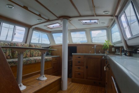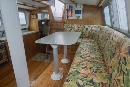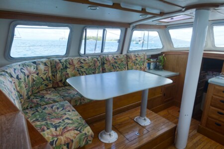 Two steps lead up to the raised deck saloon. Nine large windows create a bright space and provide excellent visibility for the beautiful life at anchor. Forward and to port is the reading nook with a display space for plants or cozy interior details with two 12V sockets. Aft of the reading nook is a L-shaped dinette with a convertible table. At the starboard side of the table you could put two high chairs or work at standing-height. Along the port side of the saloon behind and below the dinette there is storage and another three 12V sockets. There is convenient accessible storage beneath the table as well. The battery compartment is located beneath the seating area and easily accessible next to the companionway.