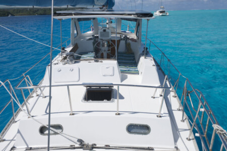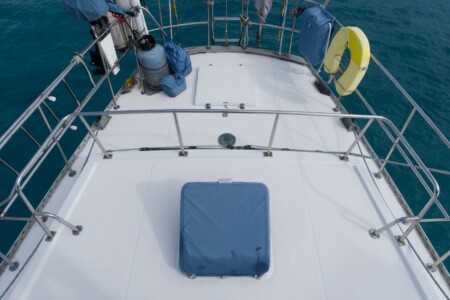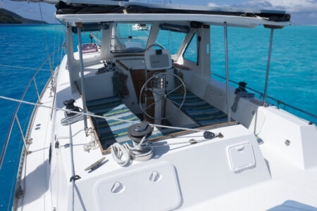 Storage is generous. The cockpit coamings hold propane and fishing gear, while a large stern locker swallows lines, fenders, boat hooks, and cruising toys. The aft lazarette functions like a garage, keeping all gear organised and secure. At the stern, lightweight dinghy davits and a boarding ladder maximise space and convenience. The port side ladder is ideal for everyday dinghy boarding when heading ashore or exploring anchorages.