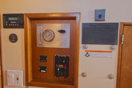 Along the port side, a robust stainless-steel workbench is fitted with a bench vise, drill press, and well-organized storage cabinets above and below, fully stocked with the tools needed for repairs and upgrades anywhere in the world. Fuel filters and manifolds are positioned for immediate access, and the engine is fully exposed on both sides, making servicing straightforward even underway.