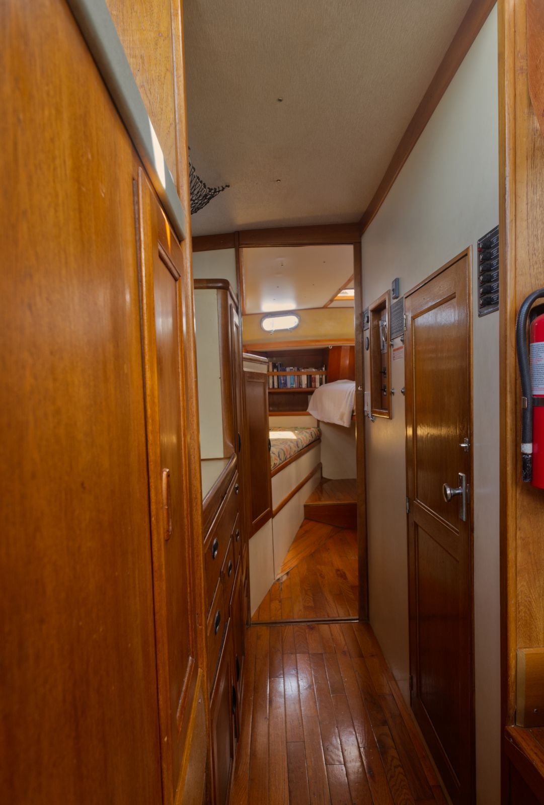 Two steps down from the deck saloon, in the starboard-side passageway to the aft cabin, is a well-equipped chart table, drawers, and storage beneath, plus a hanging locker to the side. Outboard are the electrical panels, Starlink router, EPIRB, AIS, indoor VHF radio station & two 12V sockets. To port is the access door to the engine room, along with display panels for the watermaker, solar array, and inverter.
