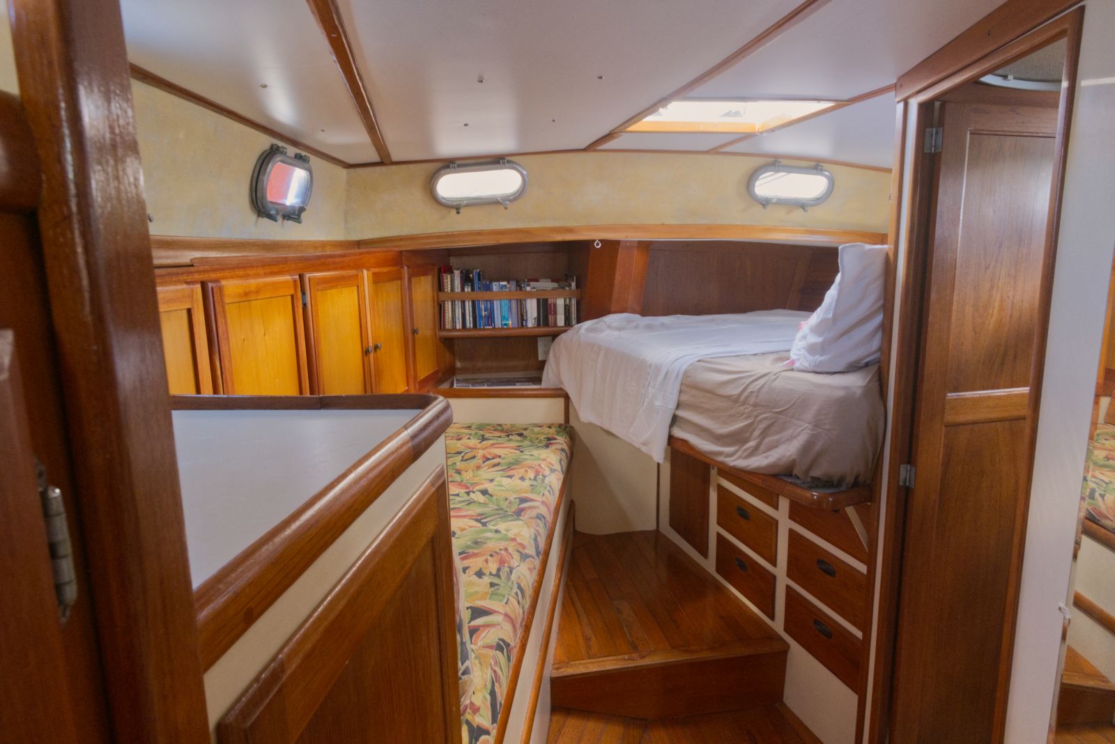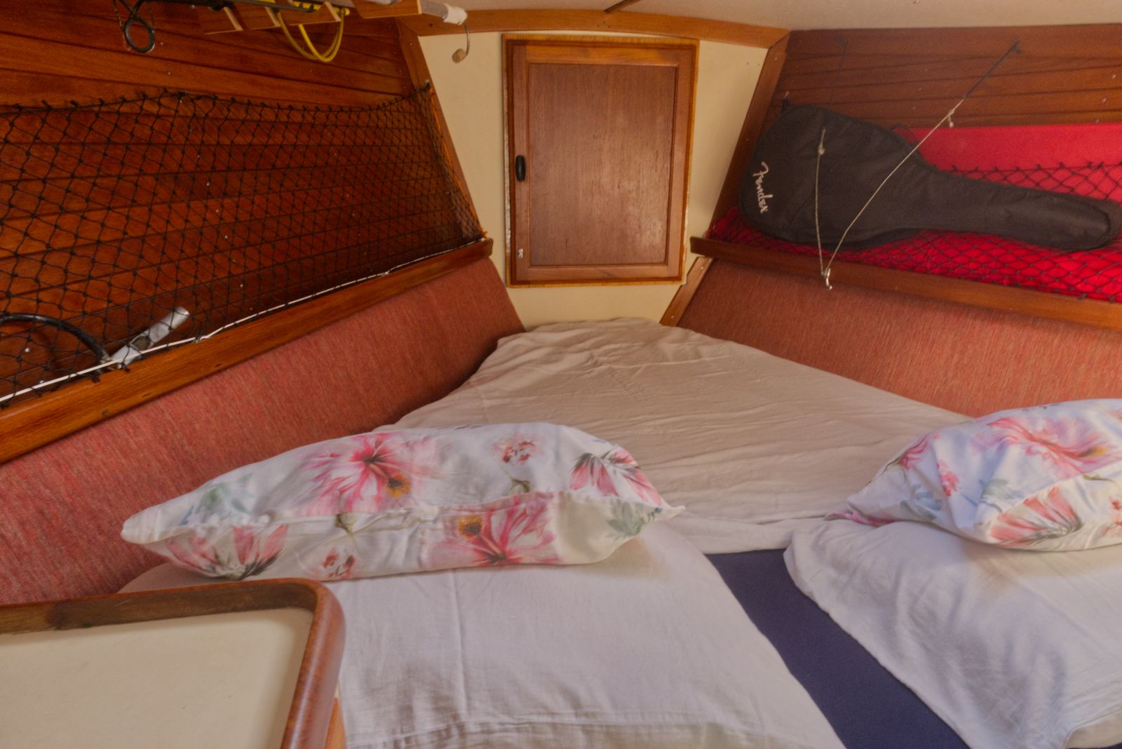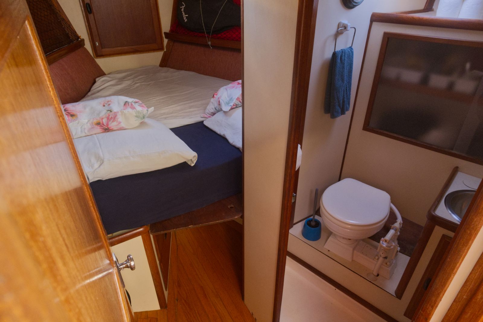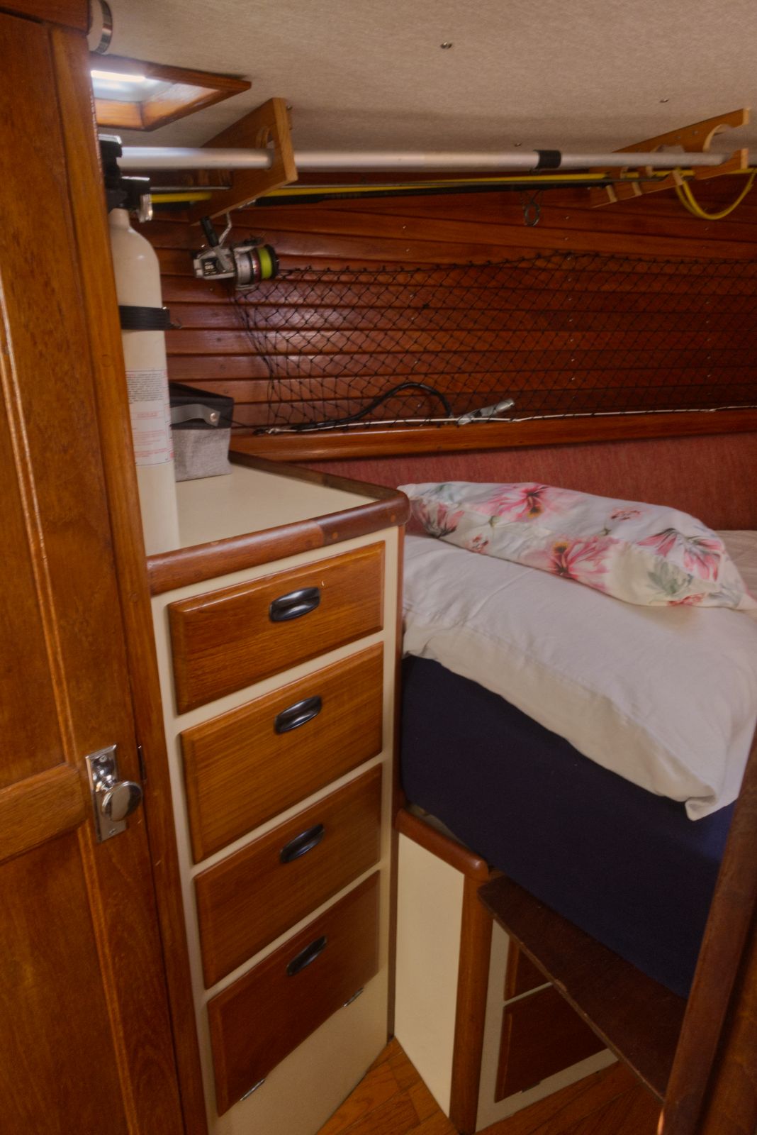 Starting forward, the guest stateroom is fitted with a V-berth and a new mattress. Four drawers are located beneath the berth, with netting for gear storage to port and starboard, and a bureau with four drawers aft. A large, lit locker is positioned aft of the bureau. Reading lights are mounted on both sides, along with two 12V sockets for fans and chargers. Access to the chain locker is forward of the berth through a door.
