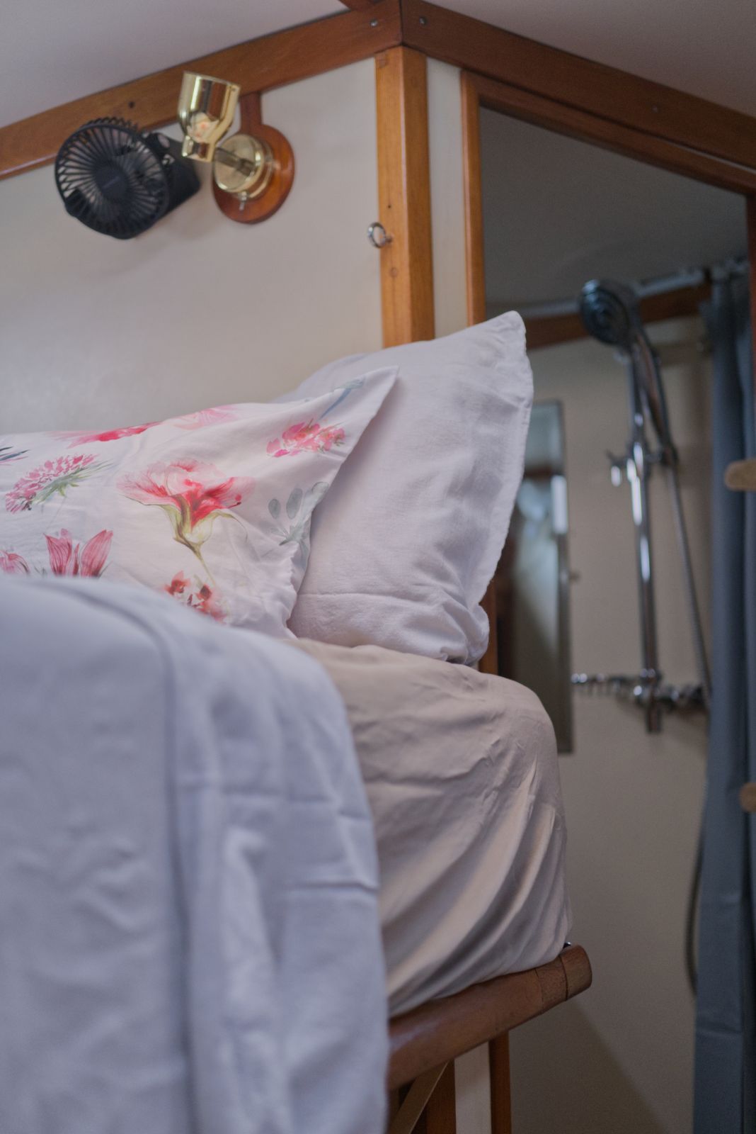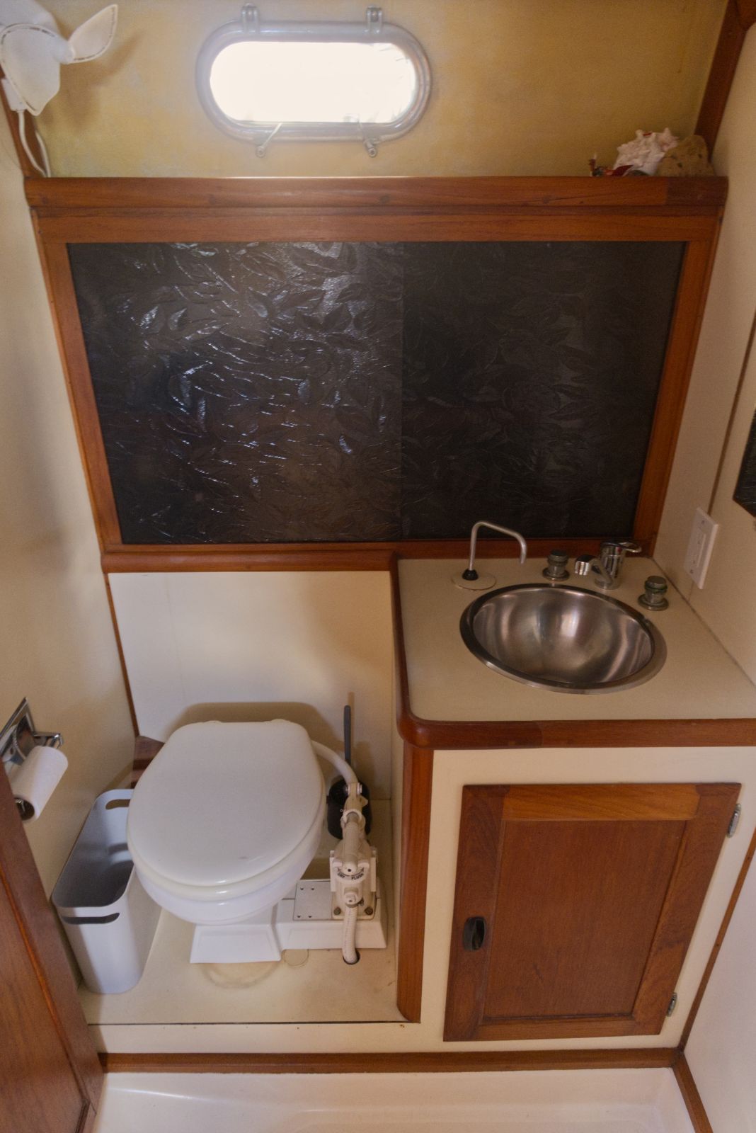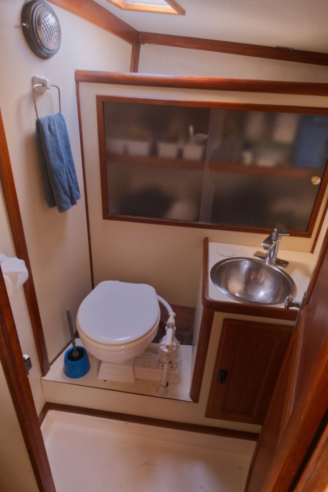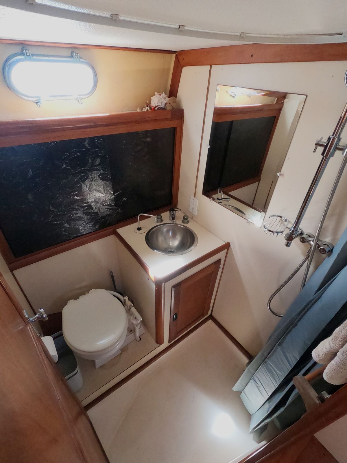 The ensuite head is located forward and to port of the berth. It features a Raritan manual head with a full-size seat (matching the forward head), a stainless-steel sink set into a vanity with a new faucet and storage below, and a large sliding-door cabinet outboard. The shower is integrated into the space, with a 360° curtain keeping the compartment dry. A Caframo fan ensures optimal ventilation for moisture control.