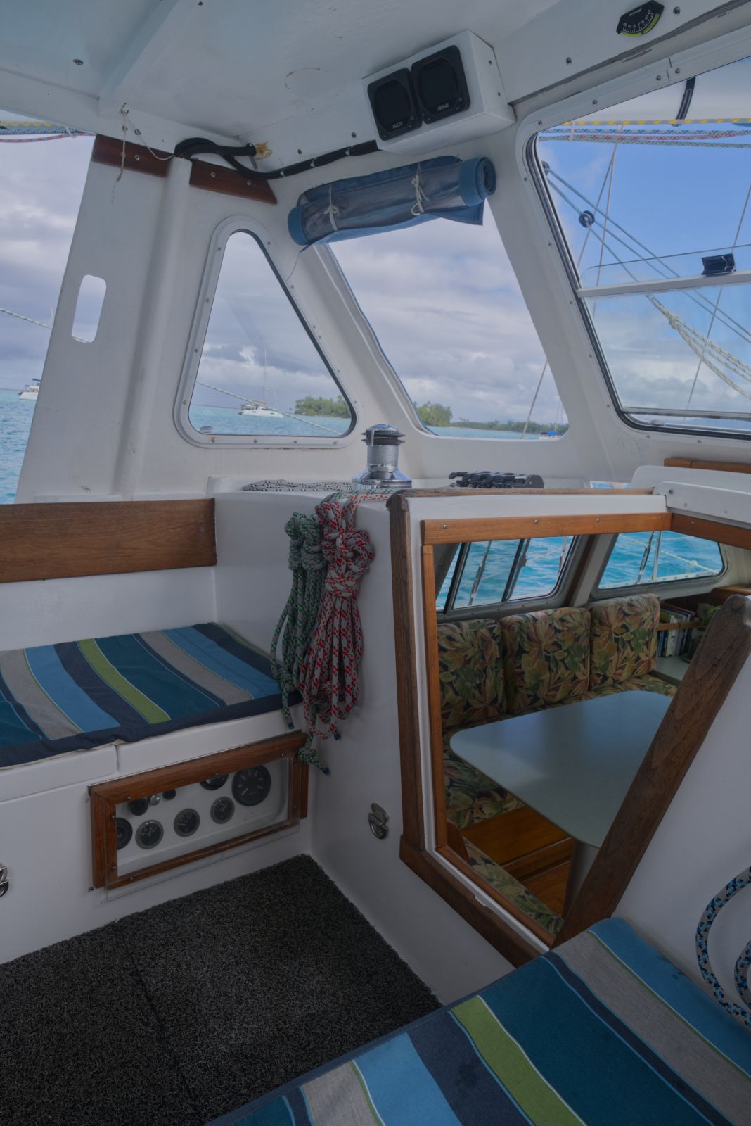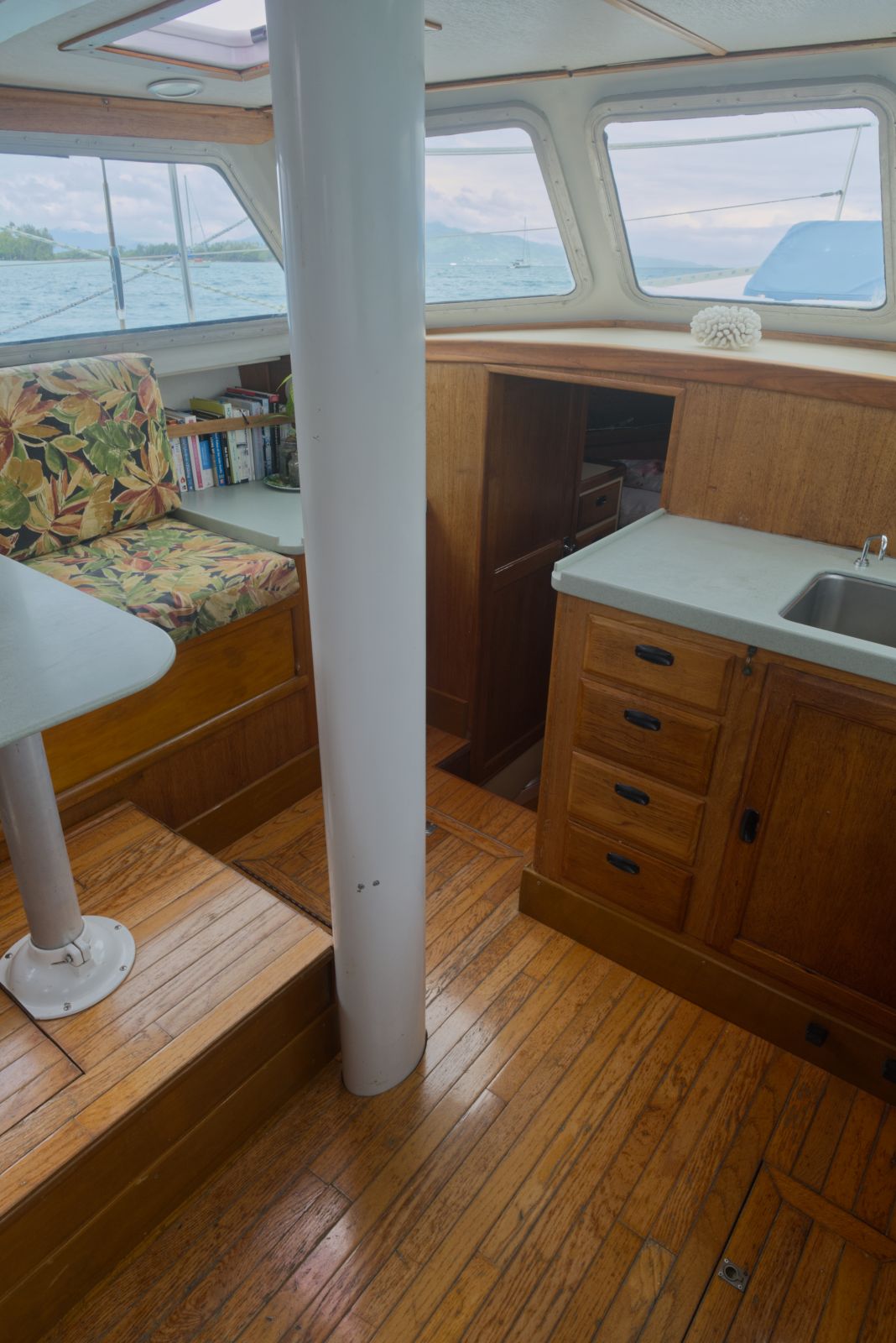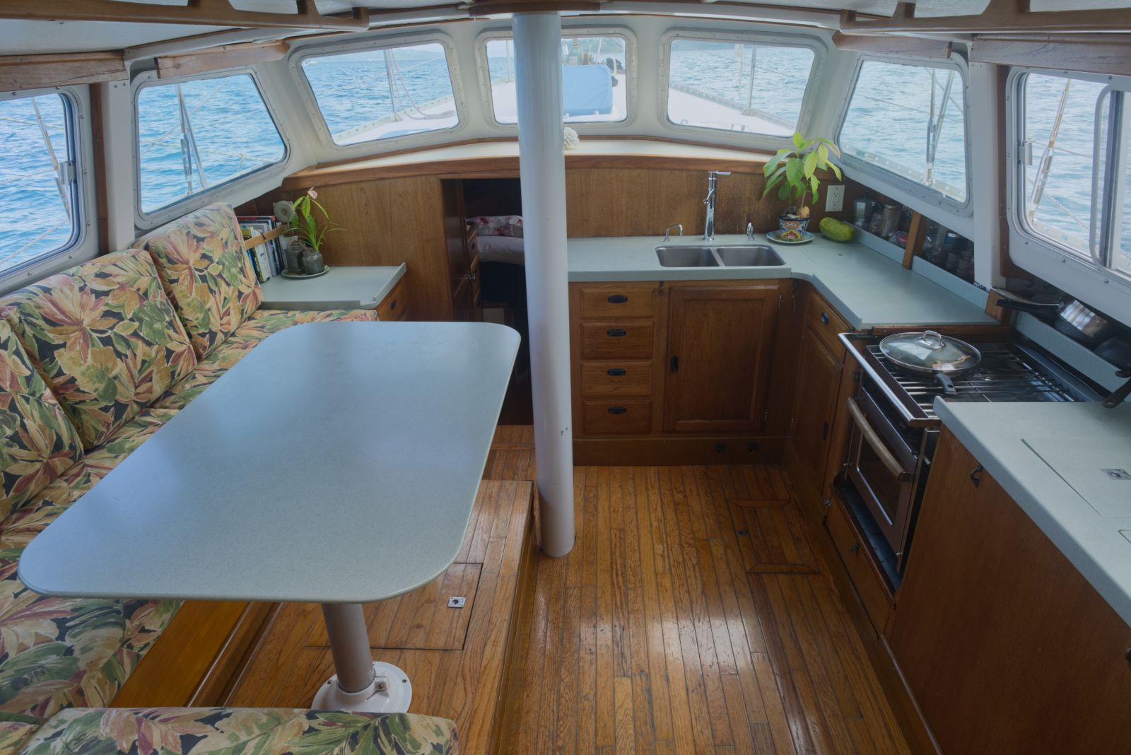 Two steps lead up to the raised deck saloon. Nine large windows create a bright space and provide excellent visibility for the beautiful life at anchor. Forward and to port is the reading nook with a display space for plants or cozy interior details with two 12V sockets. Aft of the reading nook is a L-shaped dinette with a convertible table. At the starboard side of the table you could put two high chairs or work at standing-height. Along the port side of the saloon behind and below the dinette there is storage and another three 12V sockets. There is convenient accessible storage beneath the table as well. The battery compartment is located beneath the seating area and easily accessible next to the companionway.