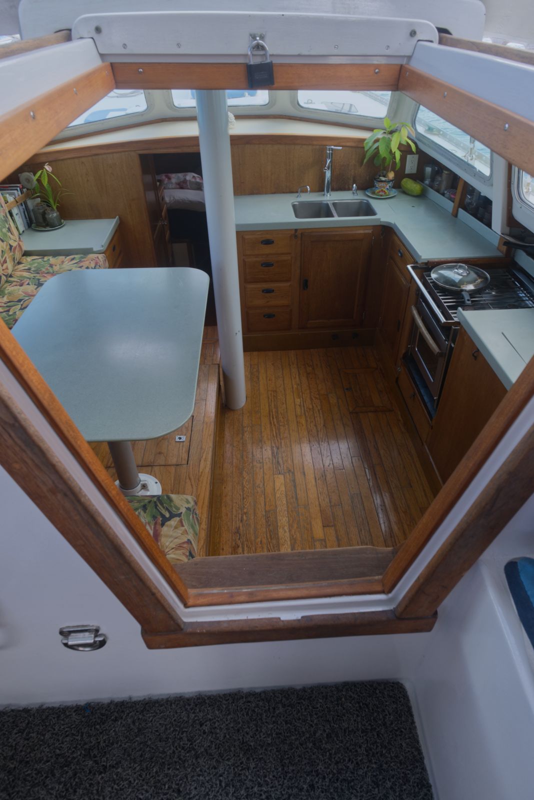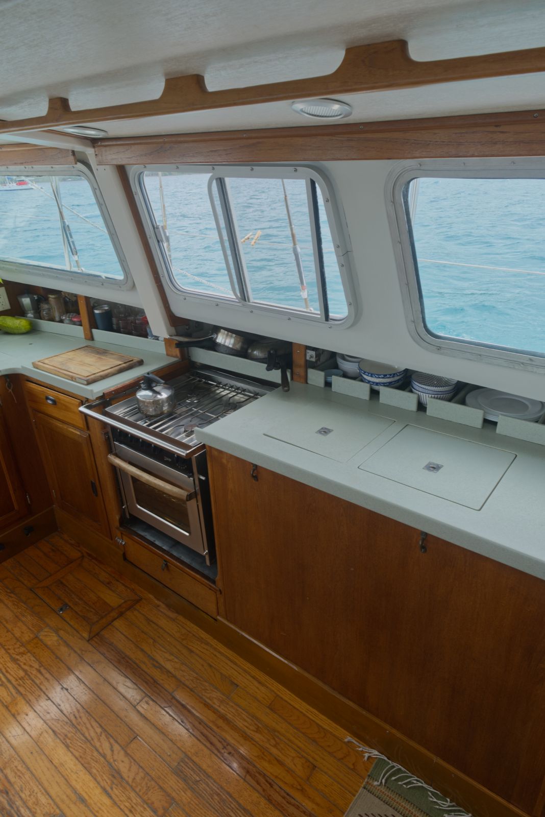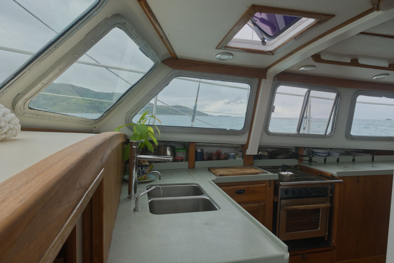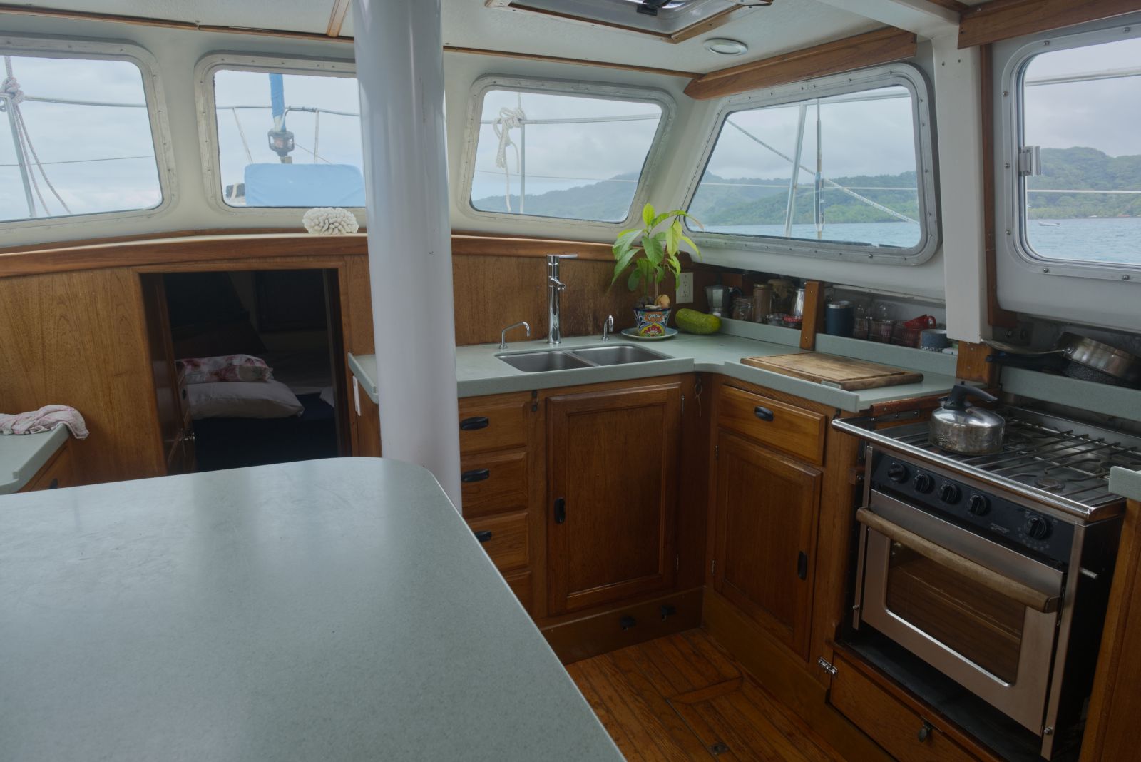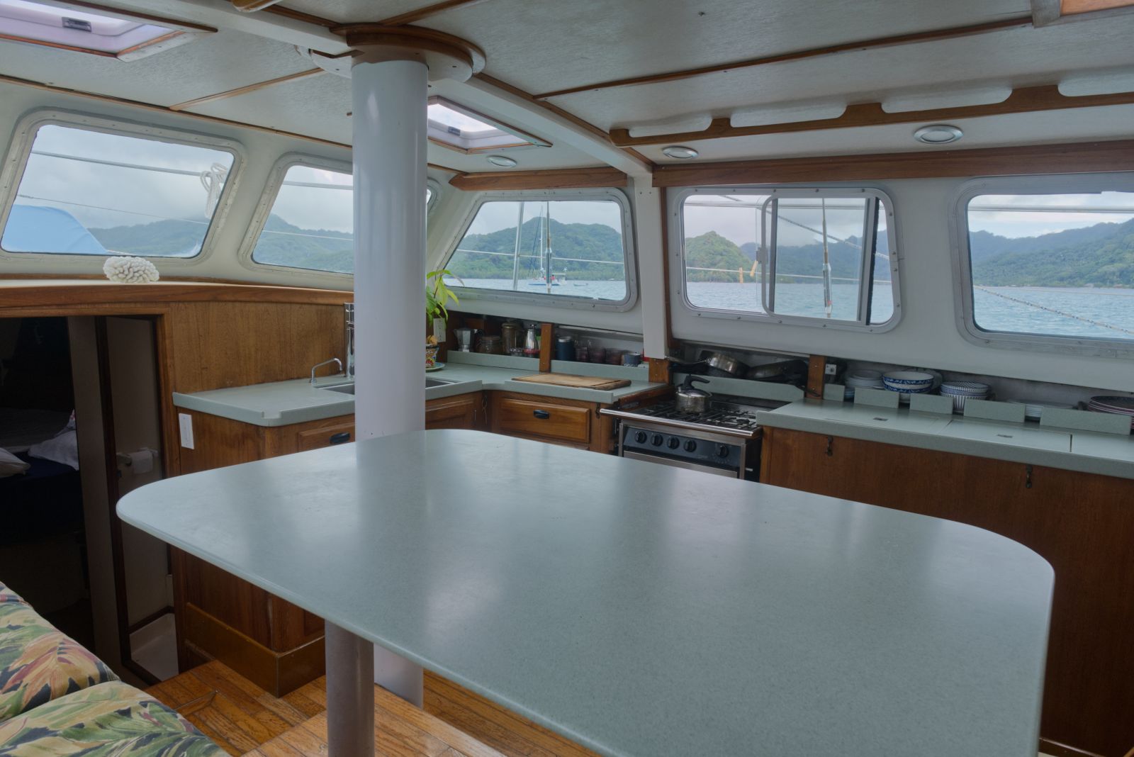 The galley is located to starboard in the saloon and offers generous Corian countertop space for meal preparation. A deep double stainless-steel sink with a new faucet is set into the forward counter. A saltwater foot pump at the starboard sink allows for pre-rinsing dishes to conserve fresh water, while a separate foot pump at the port side delivers carbon-filtered fresh drinking water from the tanks. Outboard of the counter, open lockers with stoppers provide convenient storage for dishes and everyday essentials. Below the sink are drawers and a dedicated trash bin.
