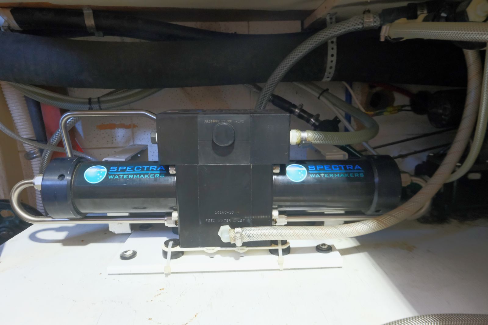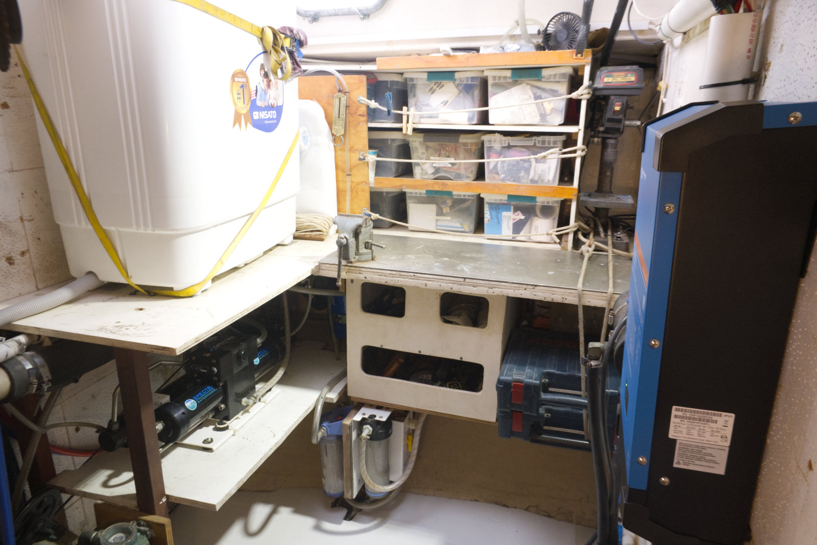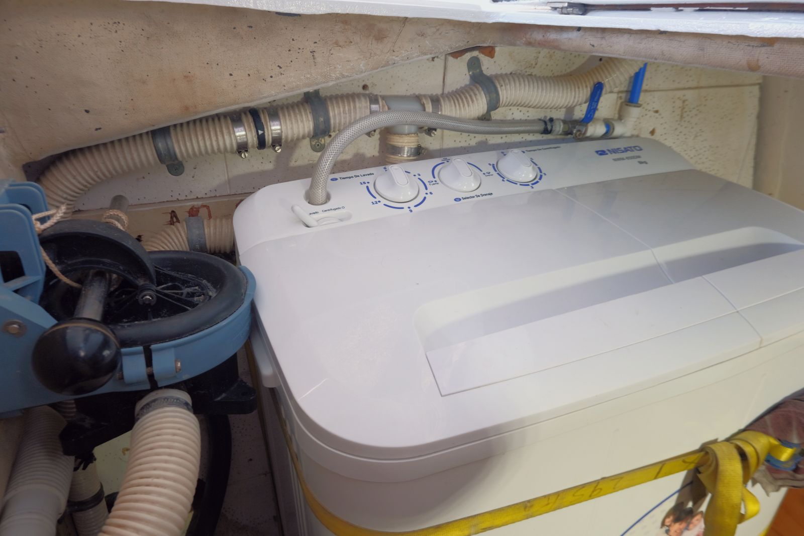The watermaker and washing machine are installed at the aft-facing side of the workbench for quick, easy operation. This space ensures that all critical systems remain accessible, serviceable, and ready to keep you self-sufficient on extended passages far from shore.